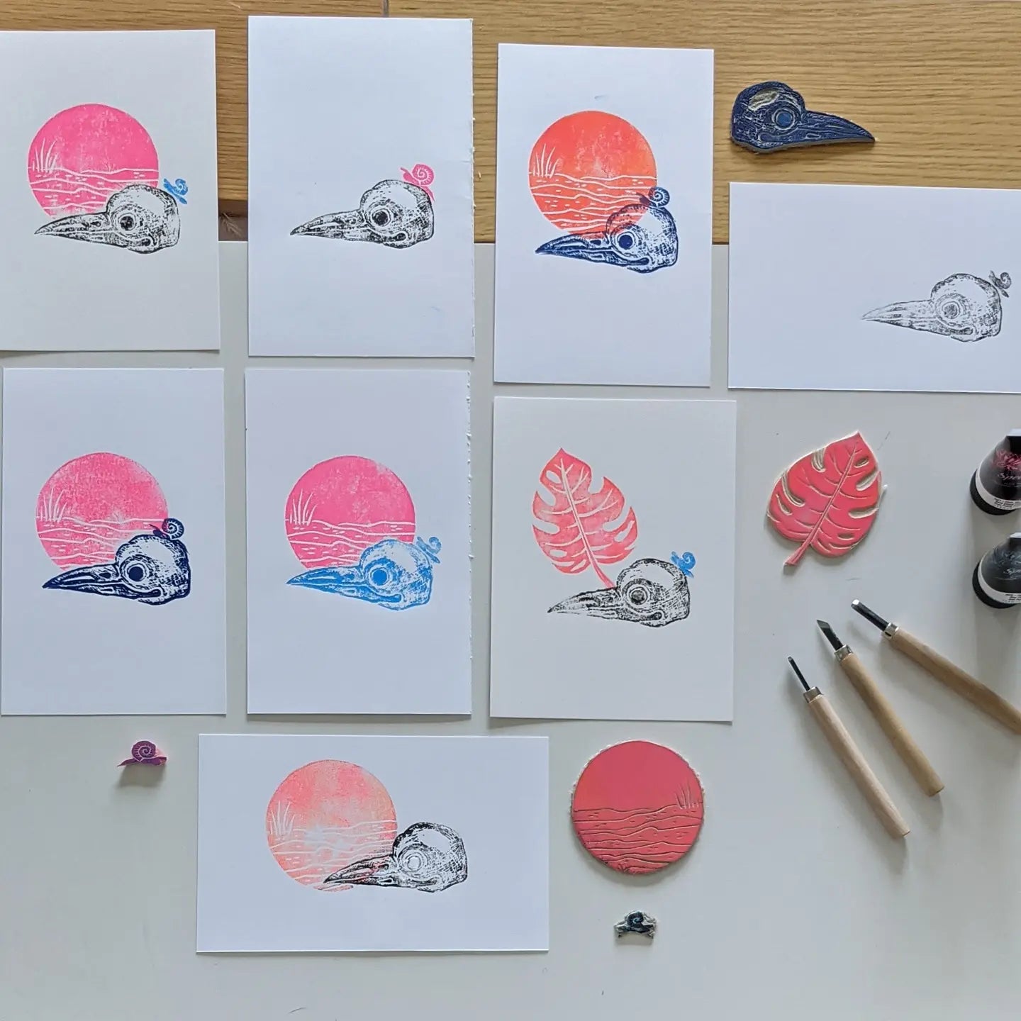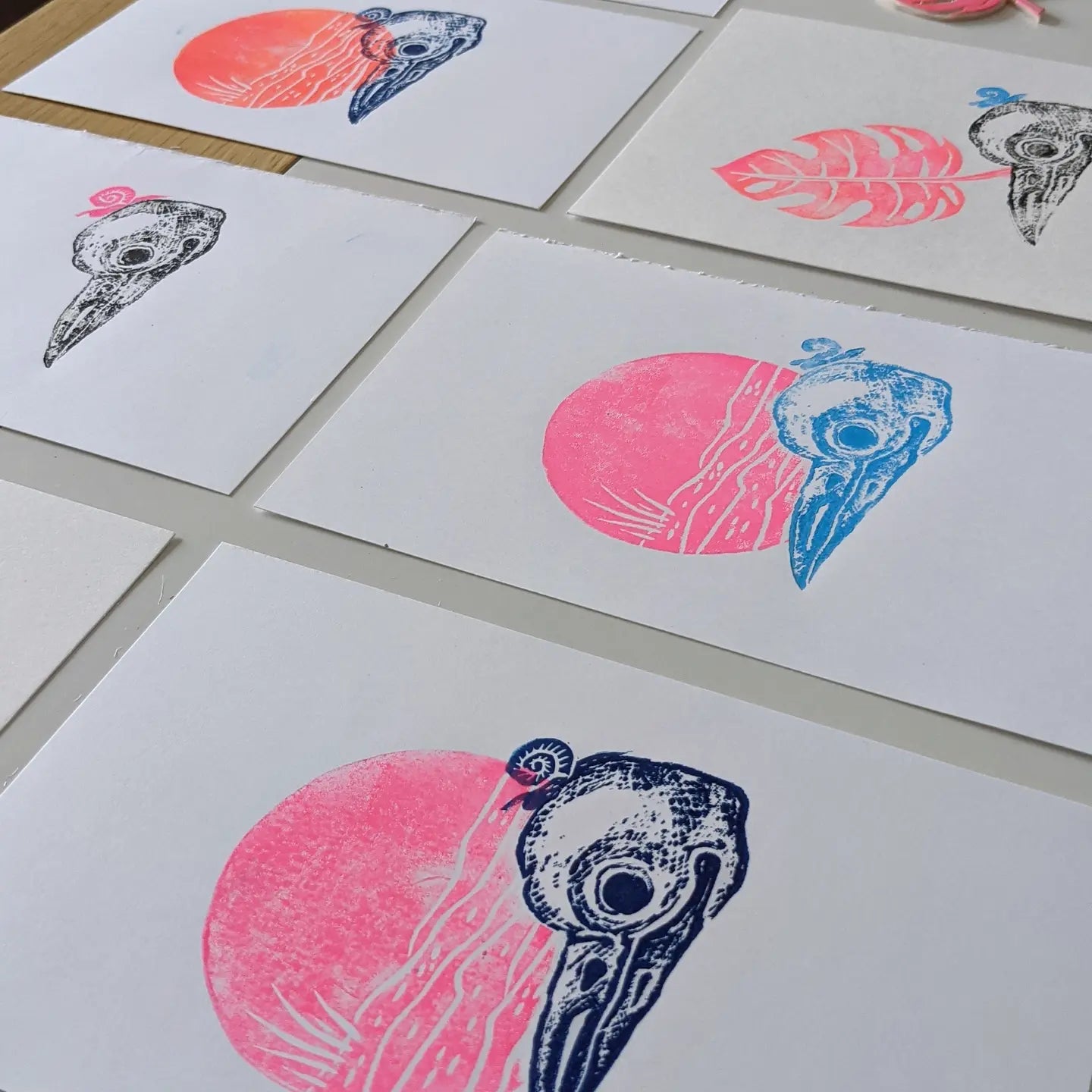 Hand printed linoprint on a 5,5x8 or 5,5x8,5 in ecru/white 170g/m2 paper. Waterbased painting.