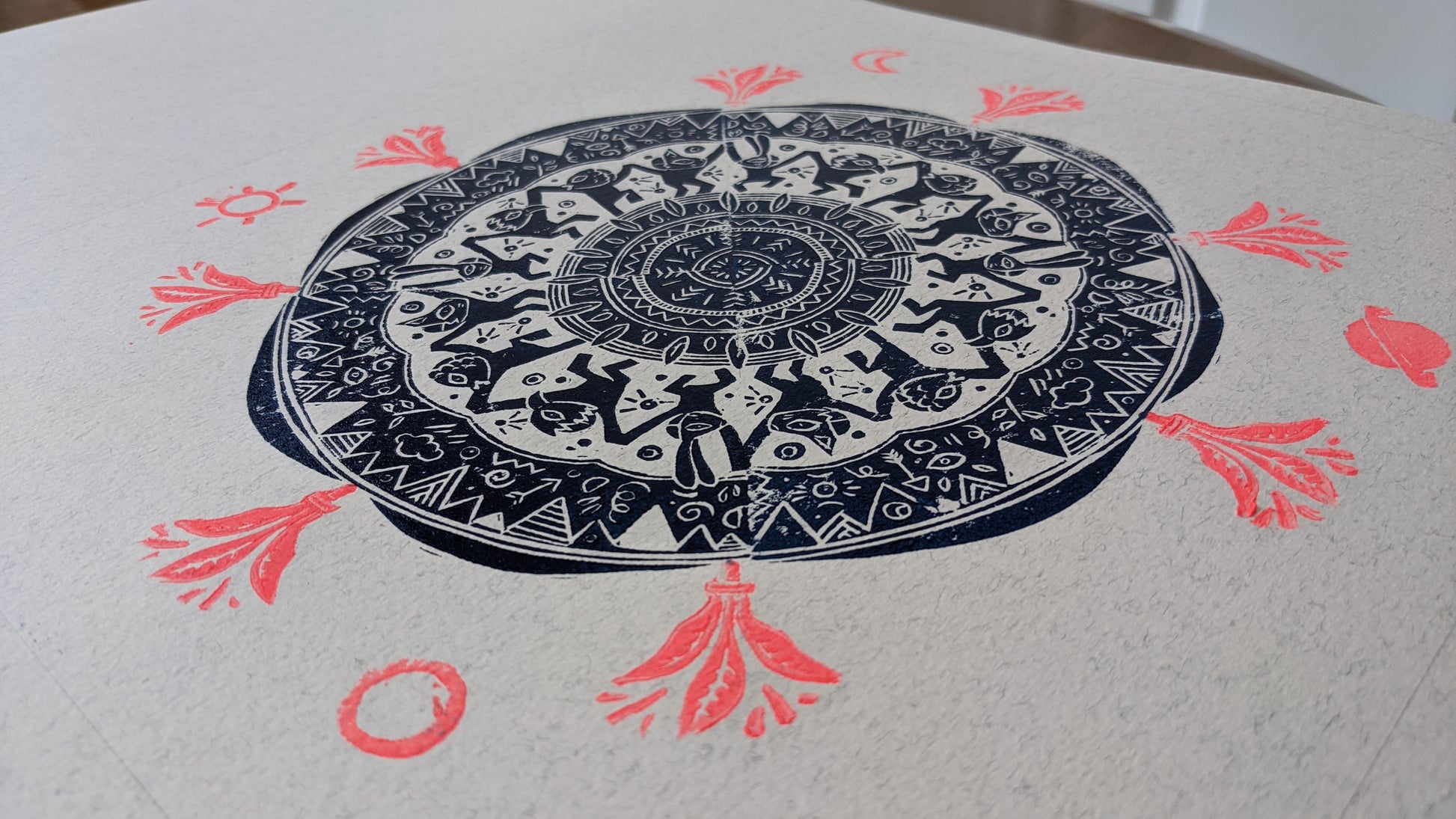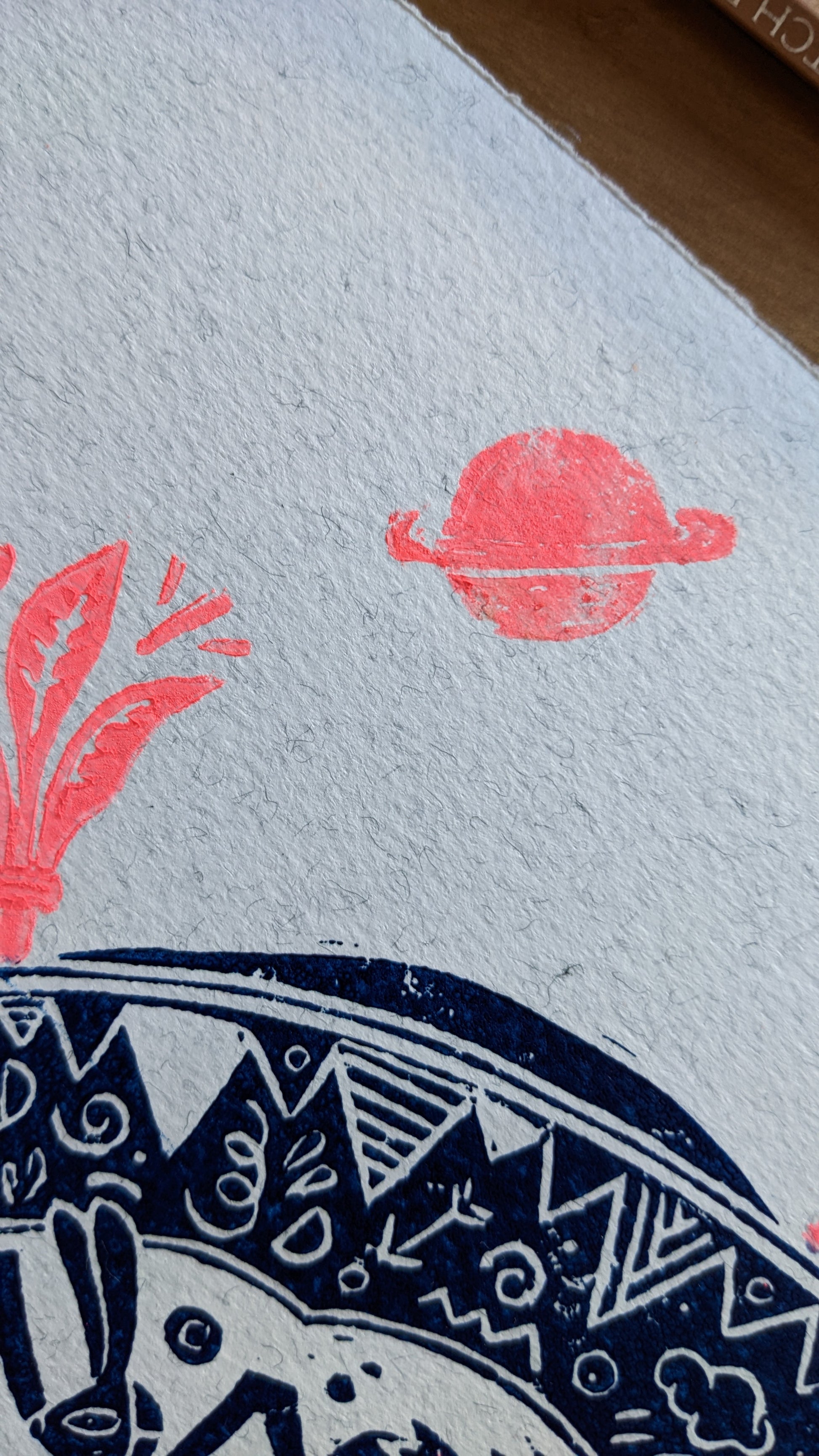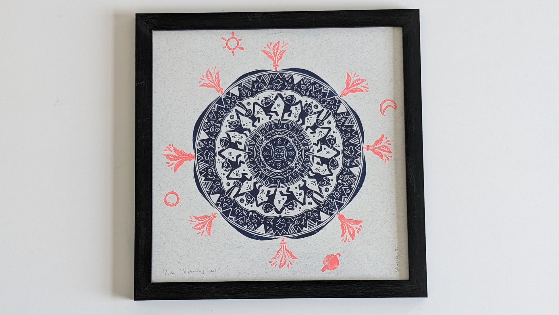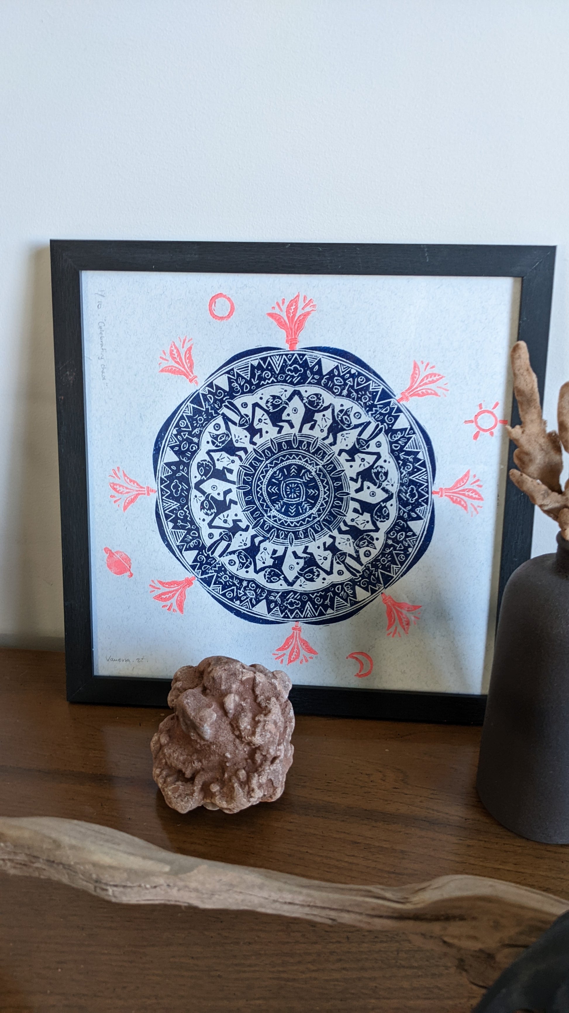 Linoprint, framed Oil on cotton paper, 12x12in, only 10 available