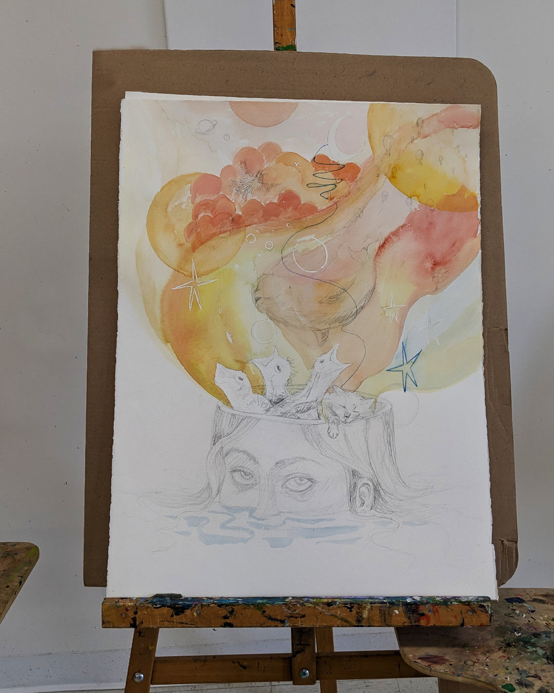 This mixxmedia painting was inspired by some lyrics "Ceux qui rêvent ont ien de la chance, et les autres ont des insomnies". In between dreams and insomnia, a whole world is created during nighttime, whether we are still awake with a lack of sleep or dreaming. The mind is amazing!