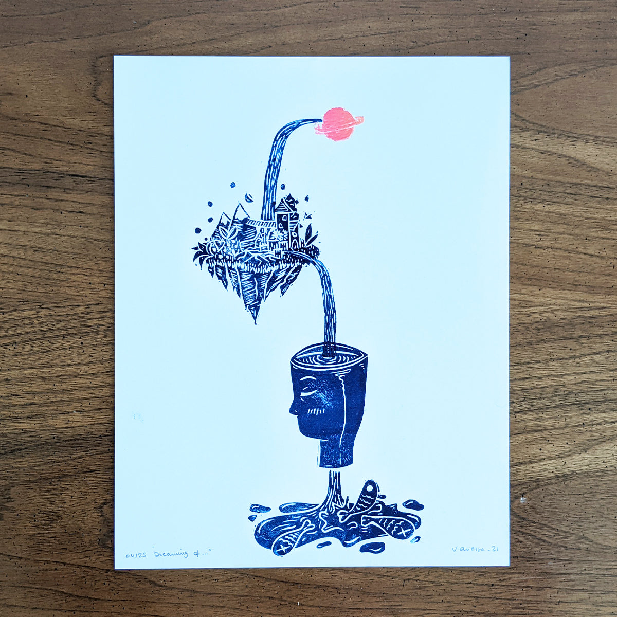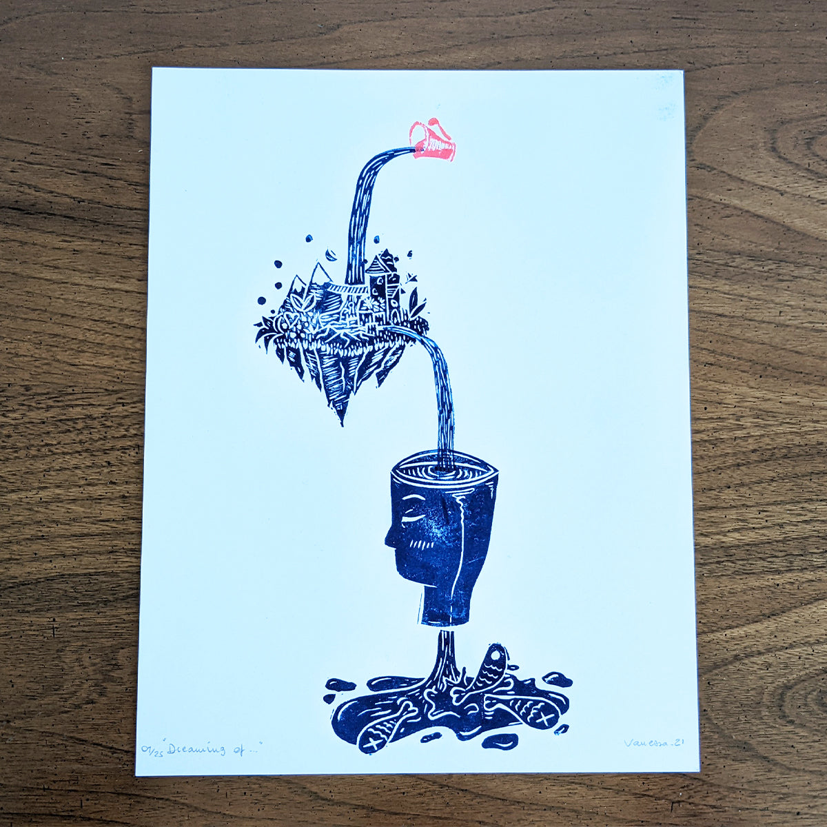 Hand printed linoprint on a 8.5x11 white 170g/m2 paper. Oil and Waterbased painting.