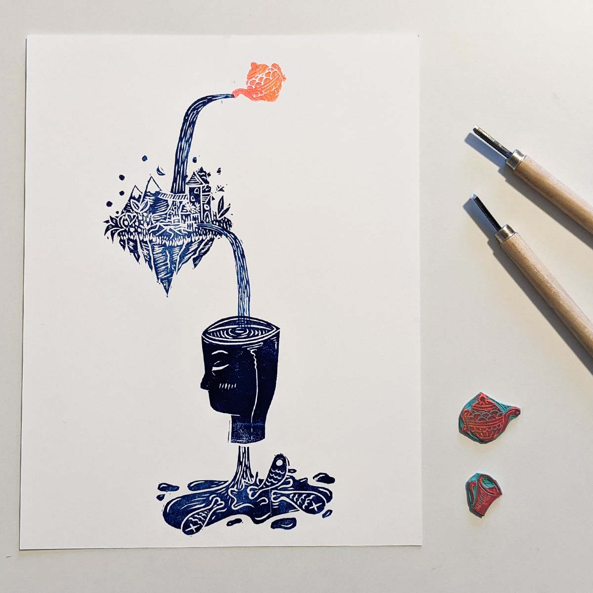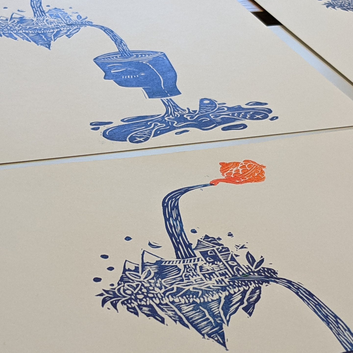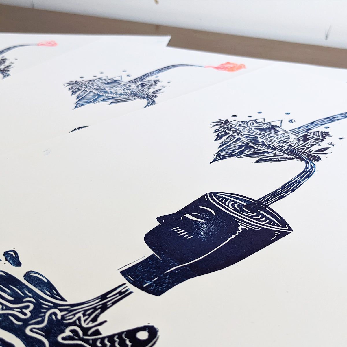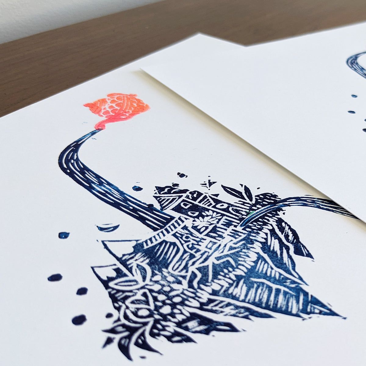 Please note that with the process of linoprinting and because this is an original print made with love, each piece of art can be slightly different, that is what makes it unique.