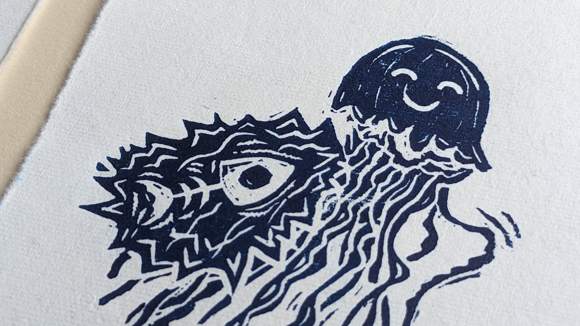 Hand printed linoprint on a 4x6 in (approx.), 130g/m2, on handmade paper by Wanderings.
