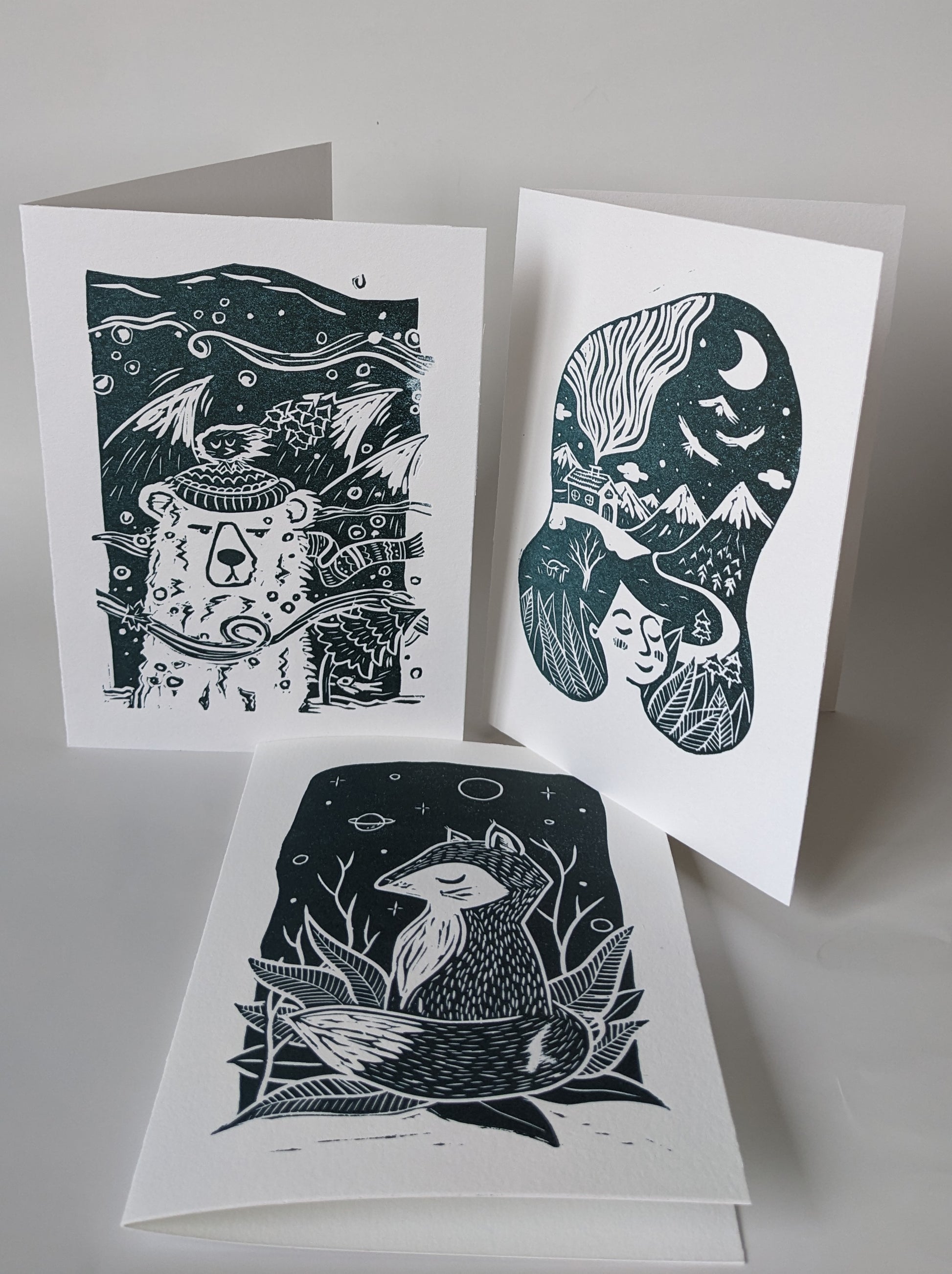 Cards in collaboration with We do design letterpress, combining both my linoprint skill and his letterpress skill.