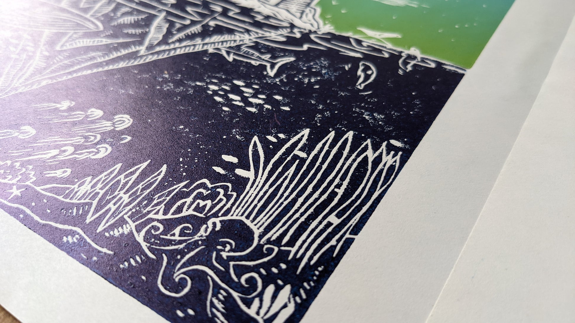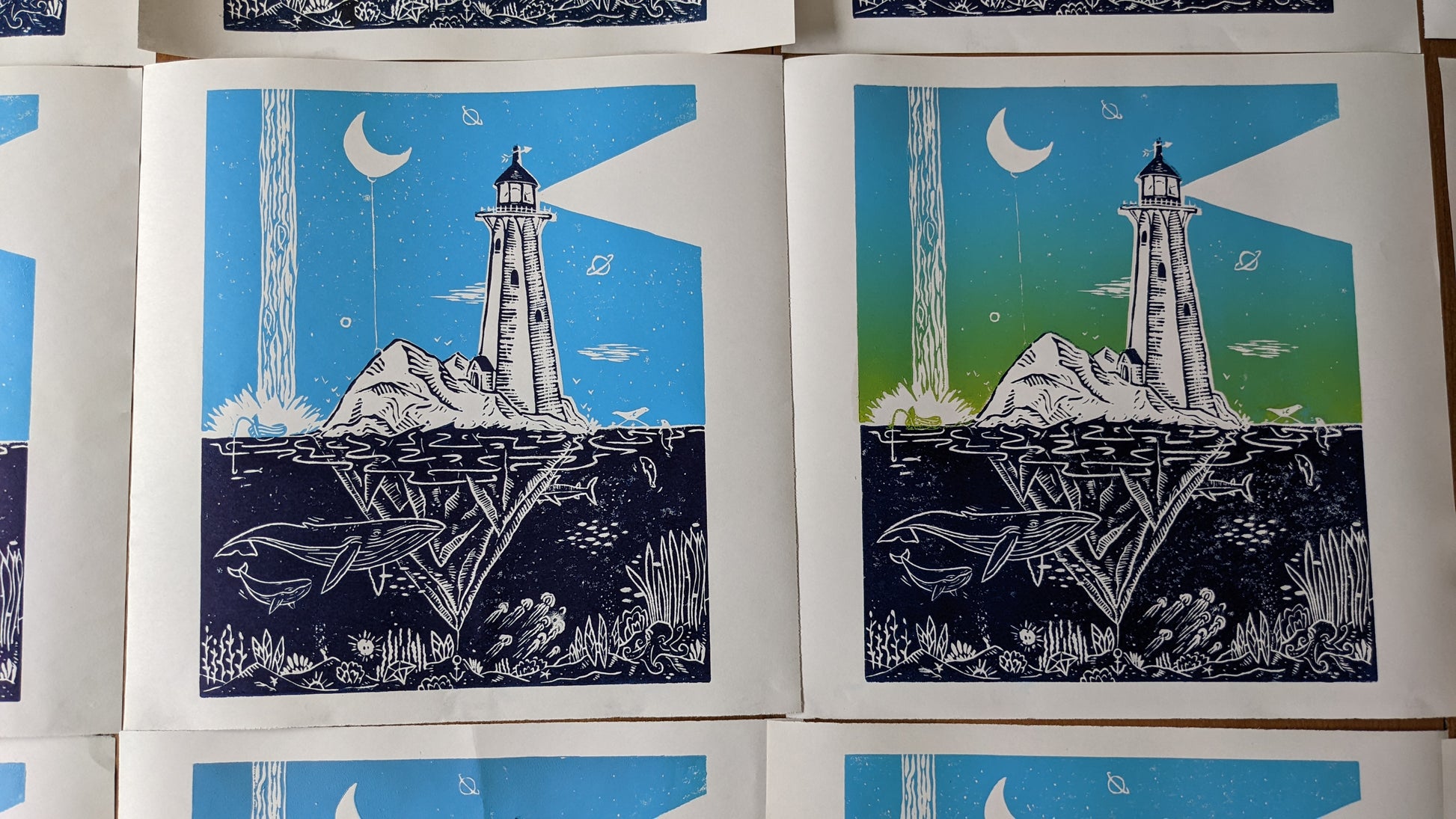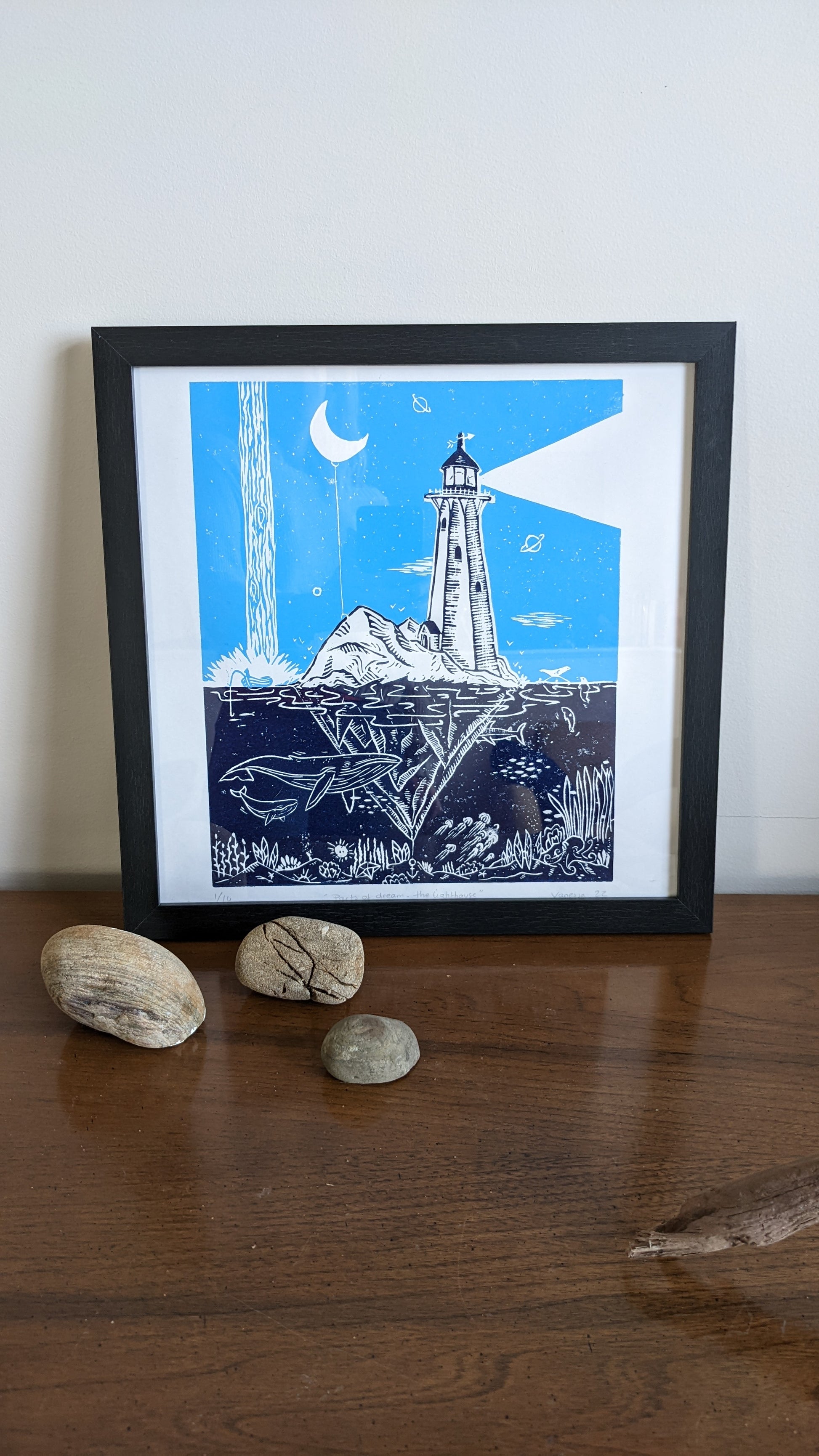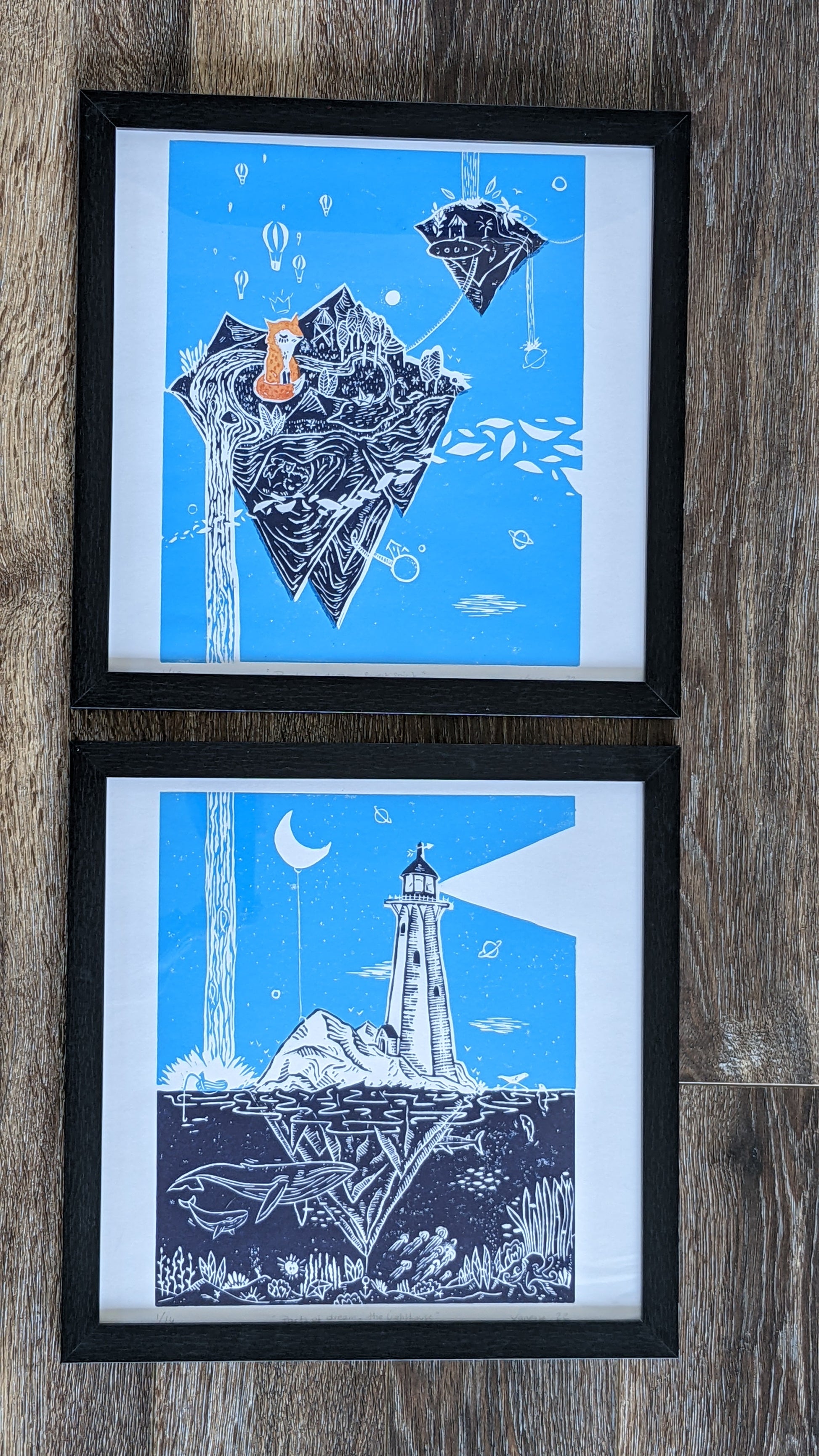 Original 2 layers linoprint, Oil painting, 12x12in, framed.