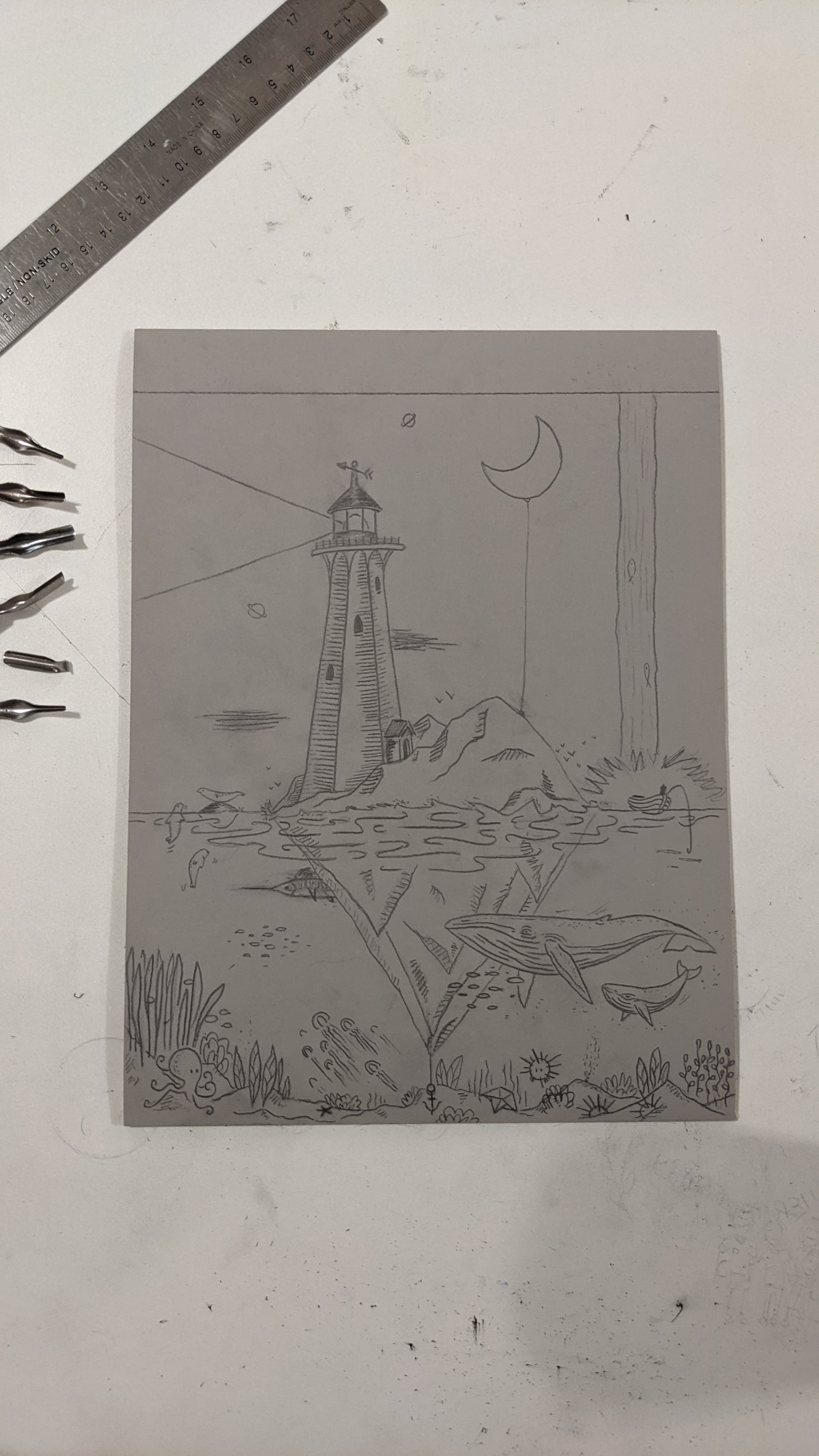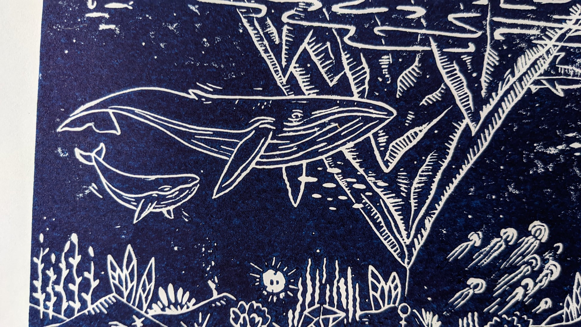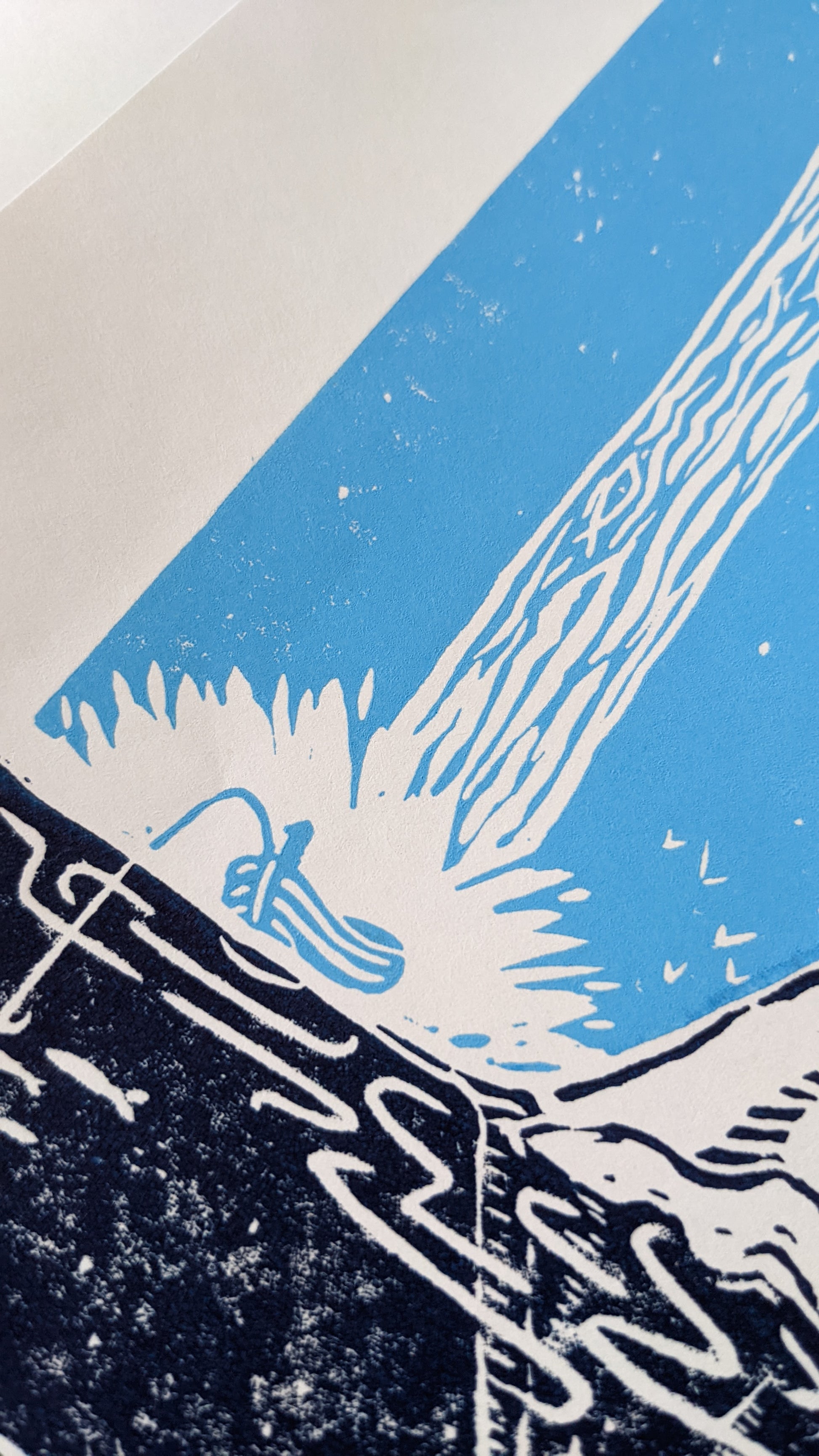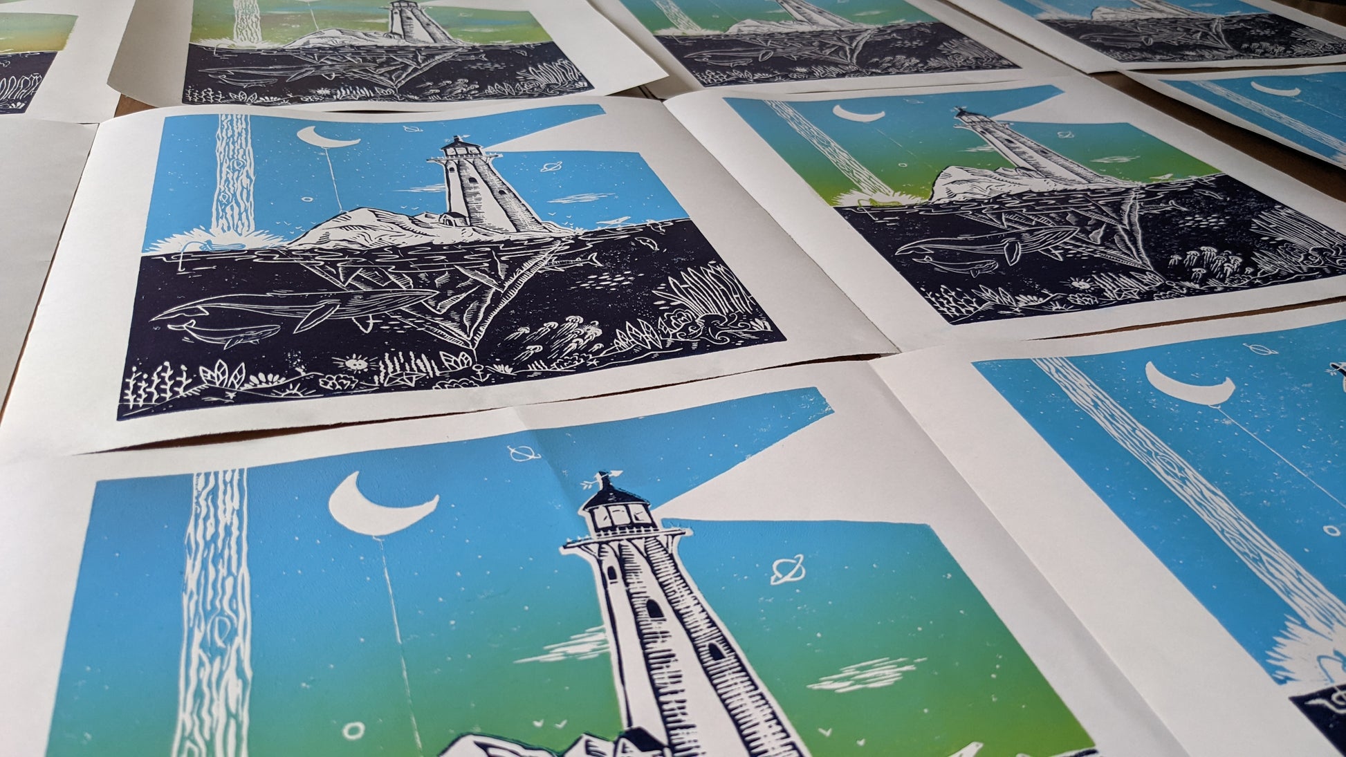 Original 2 layers linoprint, Oil painting, 12x12in, framed.