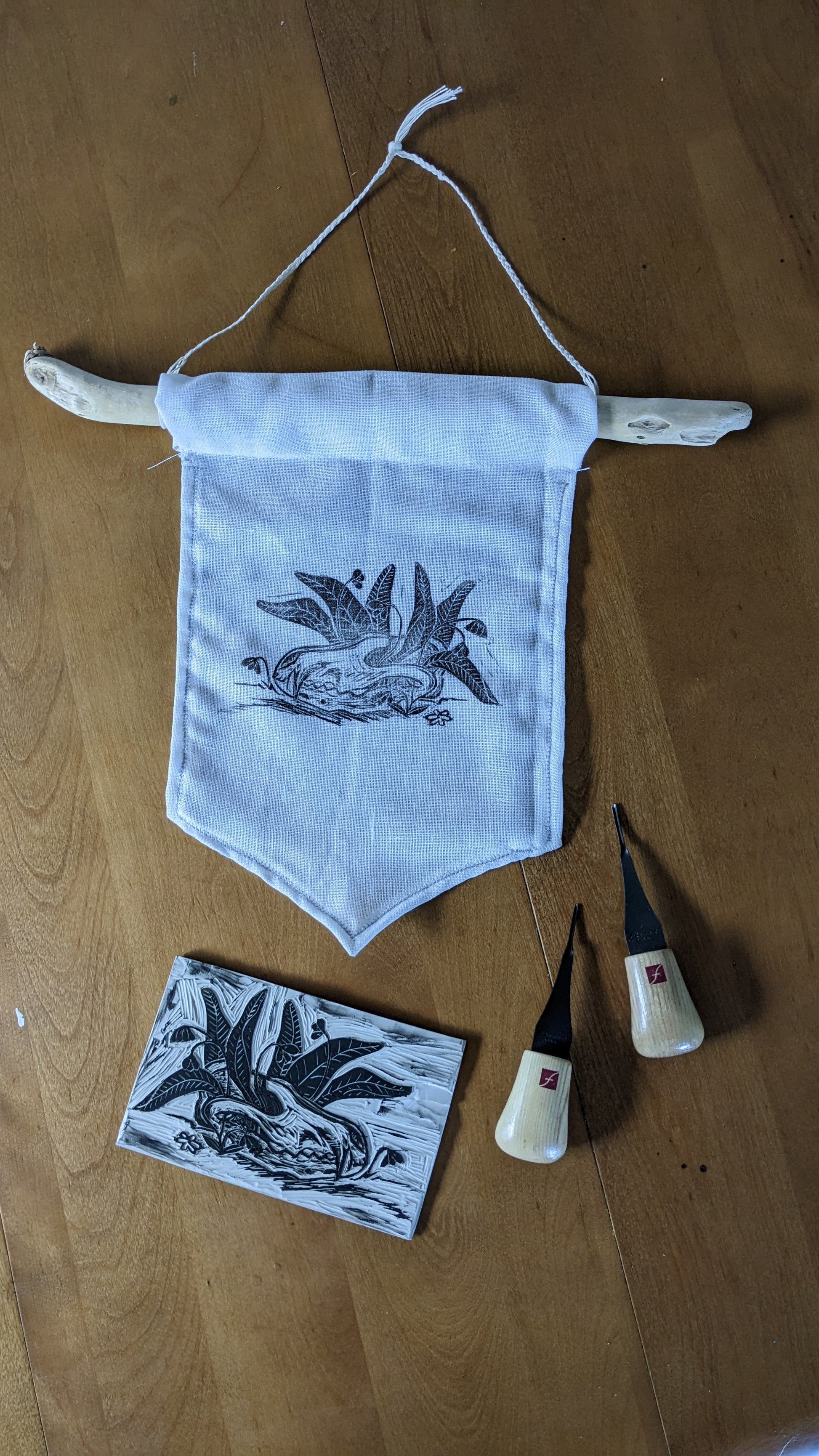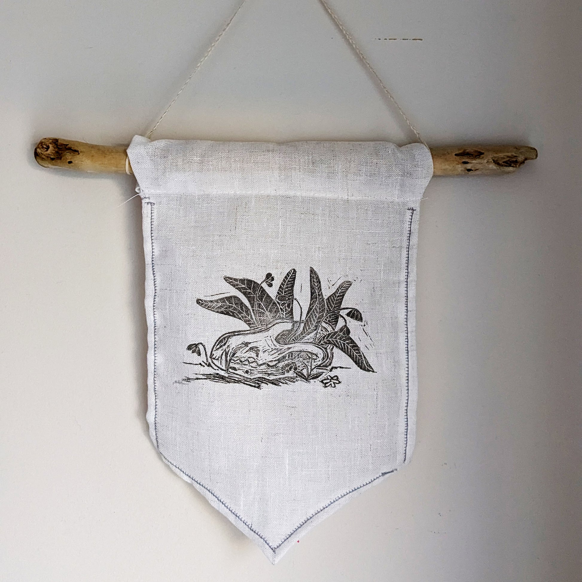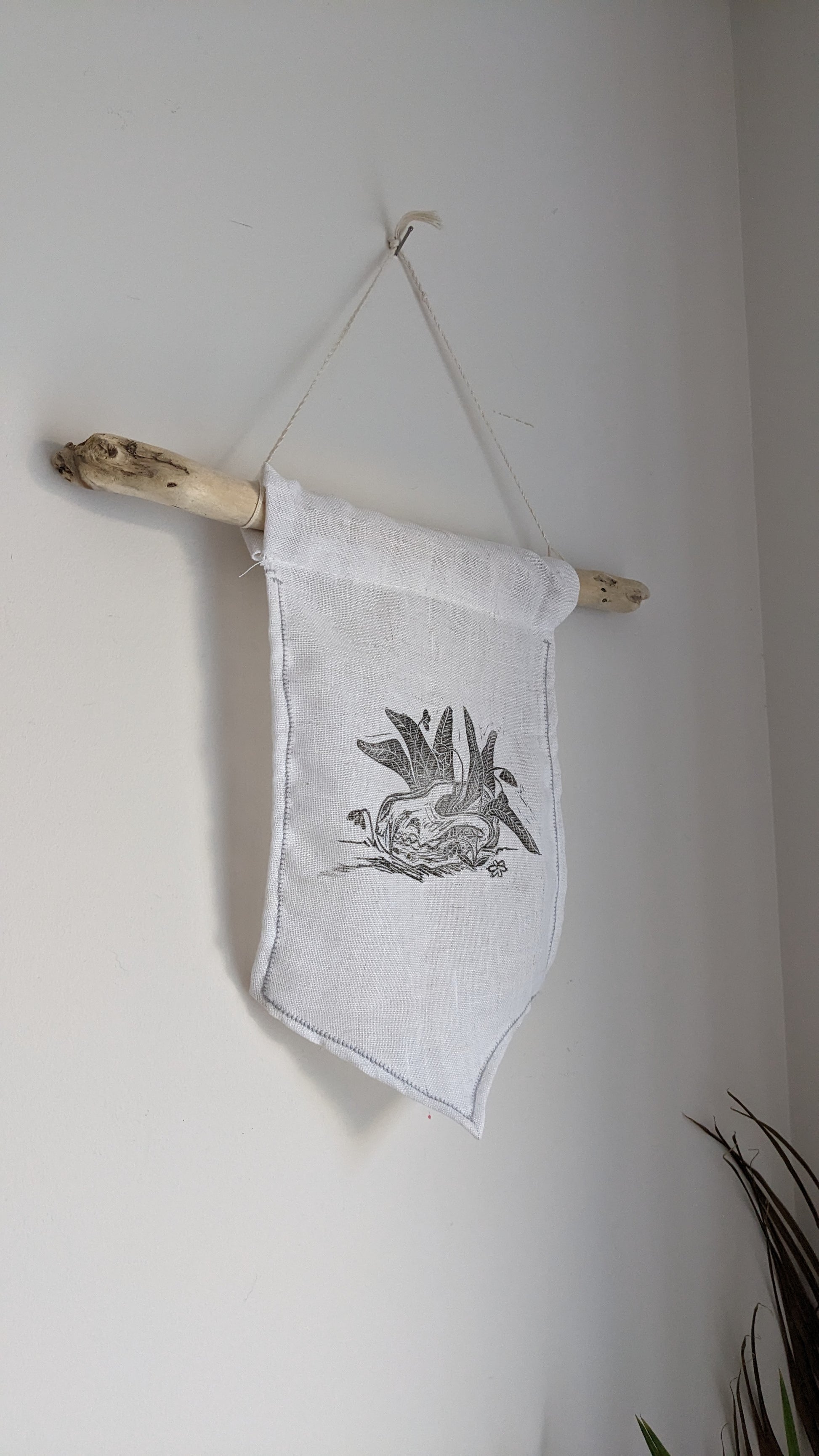 Original numbered linoprint on handmade paper or hand crafted flag (with driftwood and braided string).